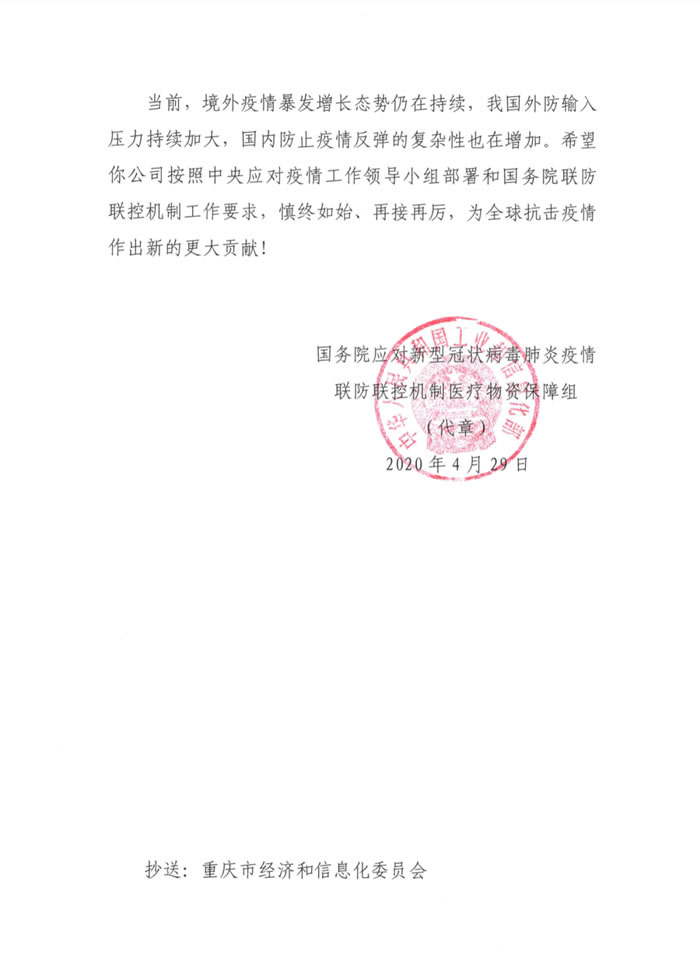 國(guó)務(wù)院應(yīng)對(duì)新型冠狀病毒肺炎疫情聯(lián)防聯(lián)控機(jī)制醫(yī)療物資保障組發(fā)來感謝信