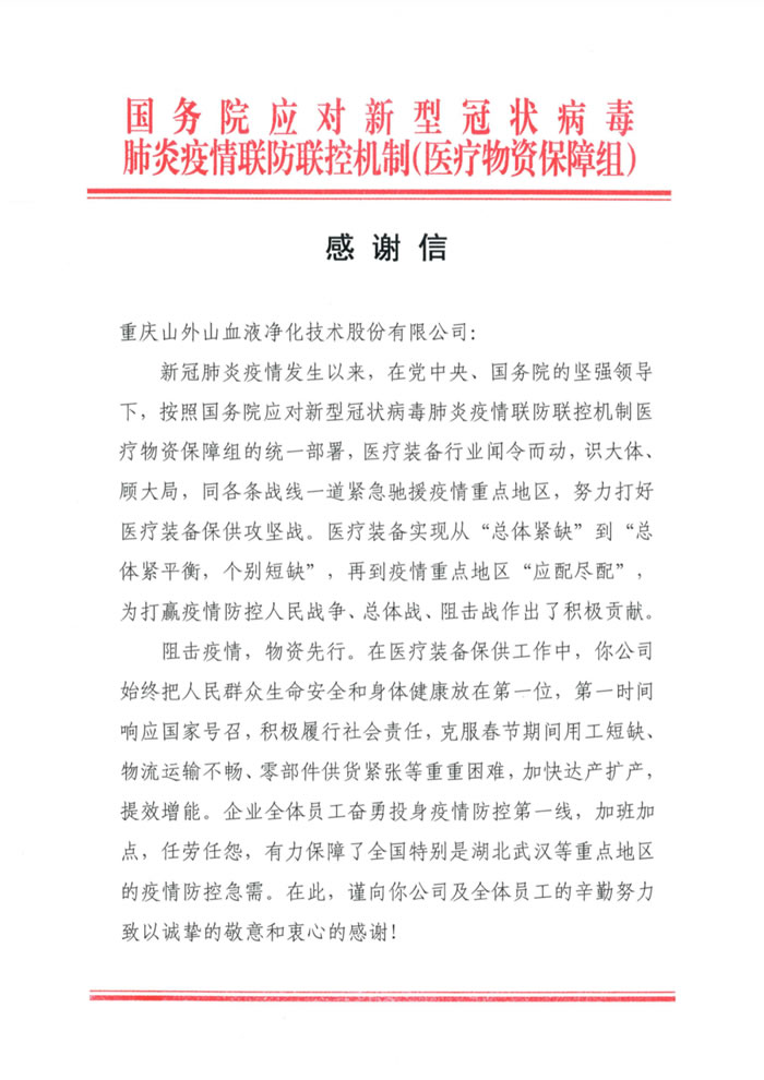 “謹(jǐn)向你公司及全體員工的辛勤努力致以誠摯的敬意及和衷心的感謝!希望你公司慎終如始,再接再厲、為全球抗擊疫情作出新的更大貢獻(xiàn)!”國(guó)務(wù)院的感謝信讓每一位山外山人都深受鼓舞和感動(dòng)。今后,山外山將不負(fù)重托,不負(fù)韶華,持續(xù)奮斗,為疫情防控取得全面勝利做出更多貢獻(xiàn),為中國(guó)血液凈化行業(yè)奉獻(xiàn)山外山力量!