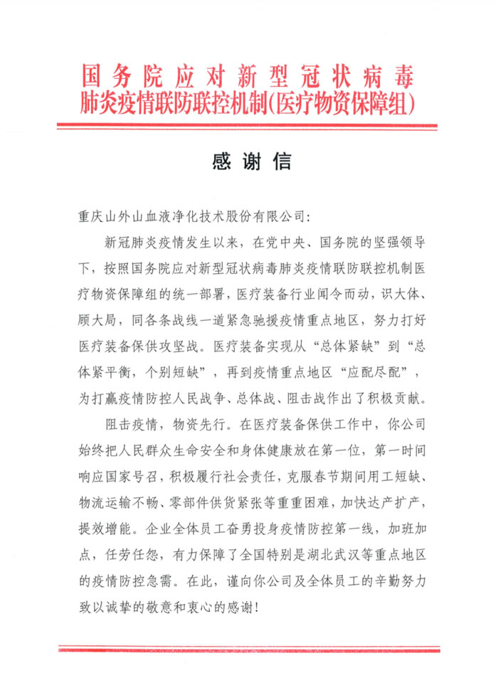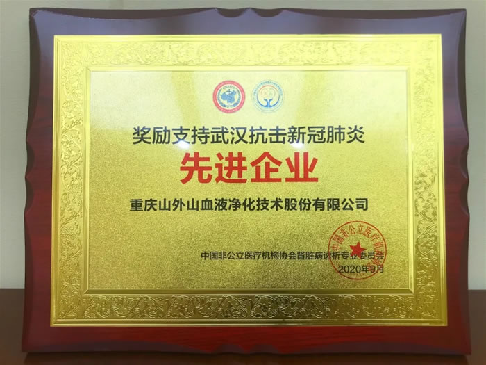 重慶山外山血液凈化技術(shù)股份有限公司由于在2020年抗擊新冠疫情中表現(xiàn)突出,獲得“支持武漢抗擊新冠肺炎先進(jìn)企業(yè)”表彰