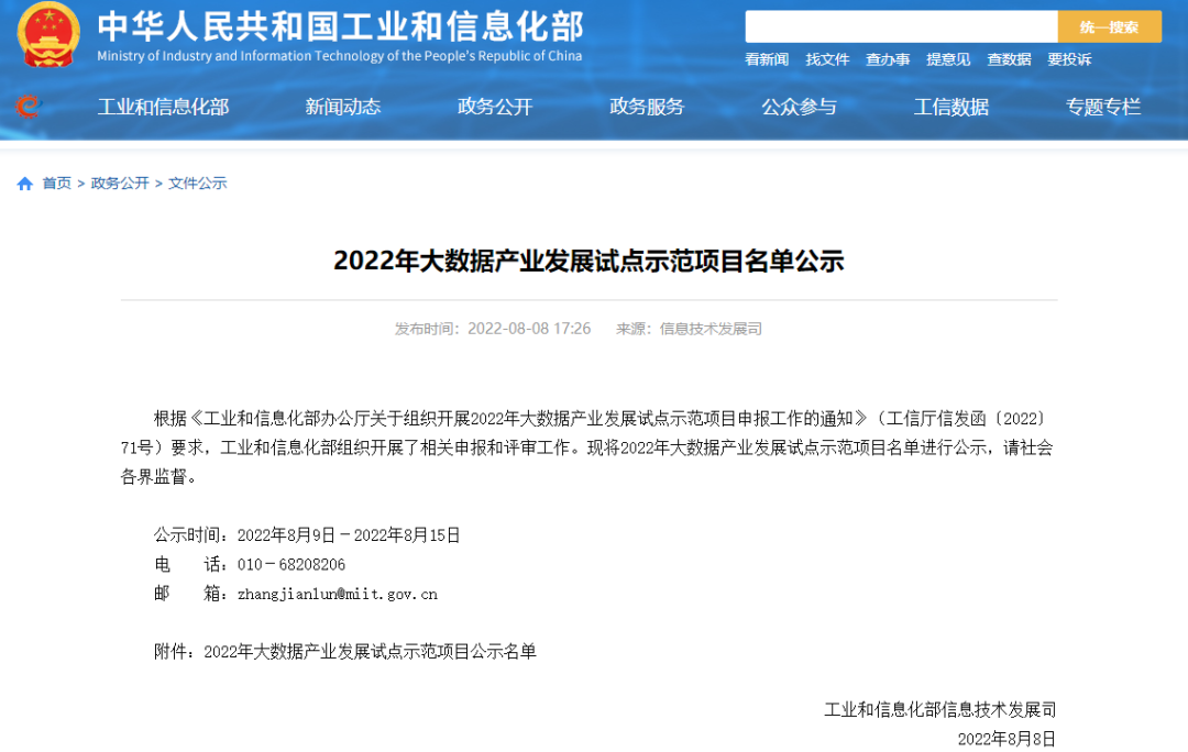 近日,工業(yè)和信息化部信息化和軟件服務(wù)業(yè)司正式公布“2022年大數(shù)據(jù)產(chǎn)業(yè)發(fā)展試點示范項目”名單。