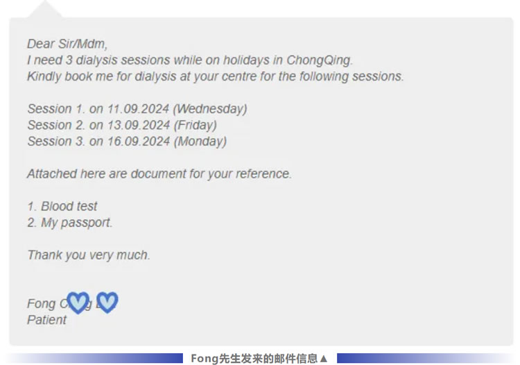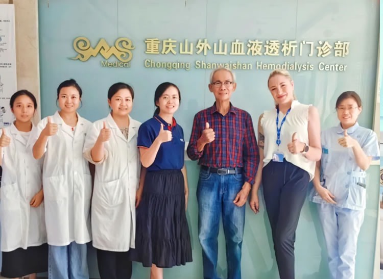 據(jù)了解,F(xiàn)ong先生今年69歲,接受透析治療已有10年。作為一名旅游愛好者,他本次不遠千里前來中國,只為領(lǐng)略山城重慶的獨特魅力,但如何定期進行透析治療卻成了難題。通過網(wǎng)上搜索以及海外腎友圈分享的口碑了解到山外山公司及其血液透析中心后,立馬聯(lián)系了山外山國際部的工作人員,最終確定在重慶山外山血液透析門診部開展一周3次的透析治療。